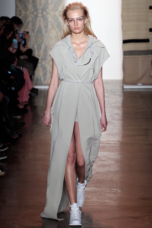 On the runway, her trench was paired with a fringe rope and silver metal necklace and white high-top sneakers, while her jumpsuit was accessorized with an iteration of the same neck candy and not much else.