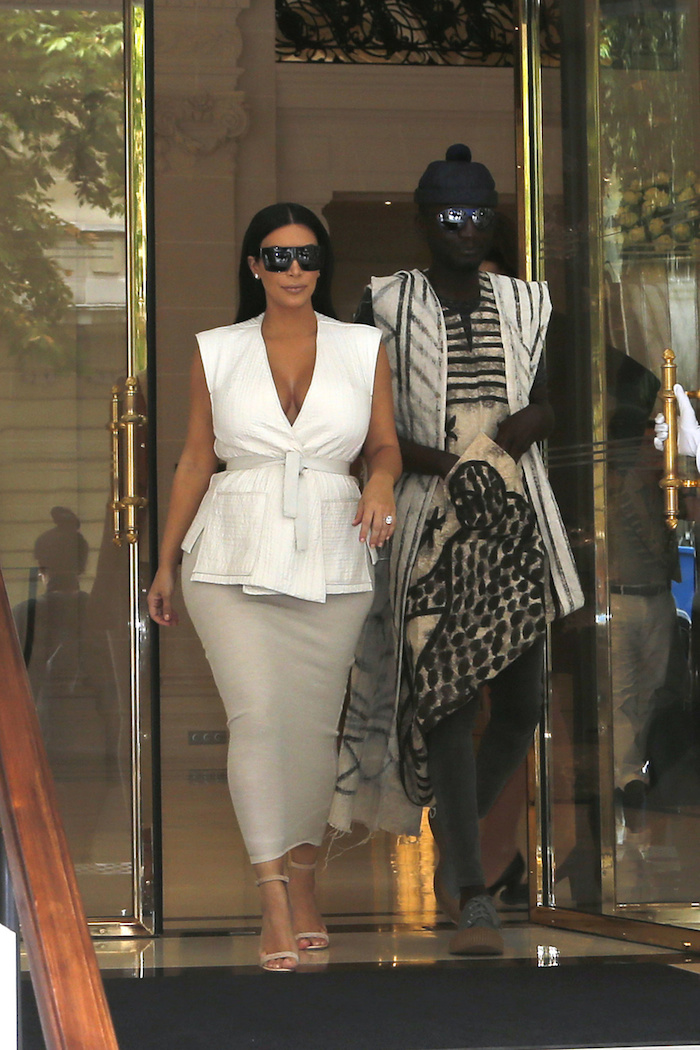 Kim Kardashian West switched up her maternity uniform for an outing in Paris, slipping on a white kimono top, a $950 Donna Karan high waist midi pencil skirt, and $725 Manolo Blahnik Chaos sandals: