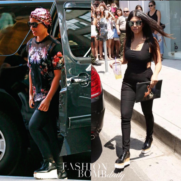 Alicia Keys attended the U2 Concert last night in New York in a Givenchy Floral Collage Print Sheer Silk Top in Black, black pants, and the same $995 Stella McCartney Elyse Platform Brogues beloved by Kourtney Kardashian: