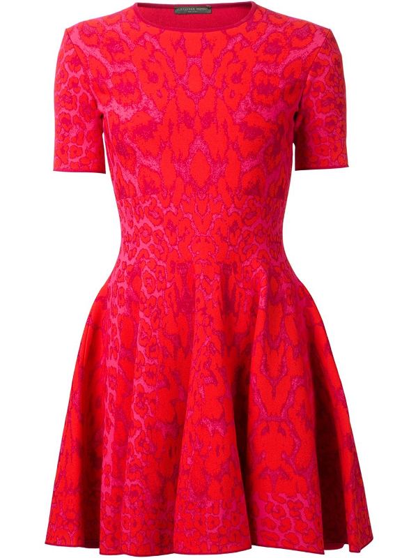 Her pink and red leopard print skater dress features a round neck, short sleeves, and a flared skirt.