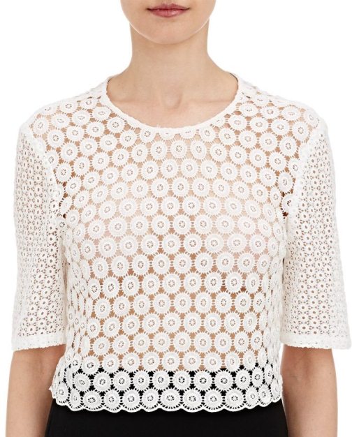Her white semi-sheer crocheted crop top features a jewelneck and elbow-length sleeves.