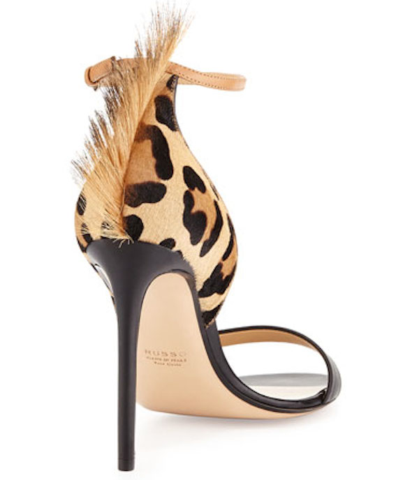 Her leopard print dyed calf hair 4″ stompers boast adjustable ankle straps and leather lining.