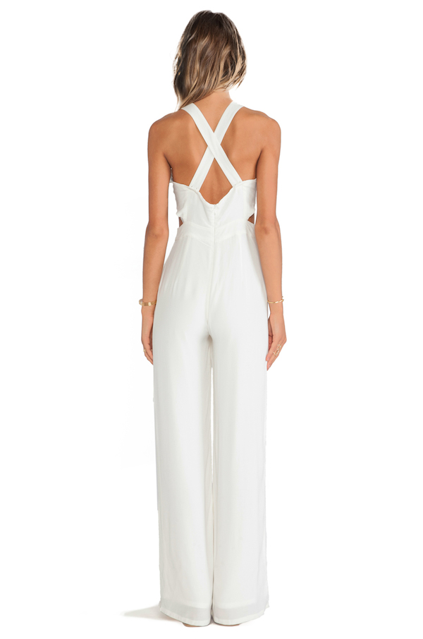Her poly blend jumpsuit features symmetrical waist cut outs, front slant pockets and a hidden center back zipper closure.