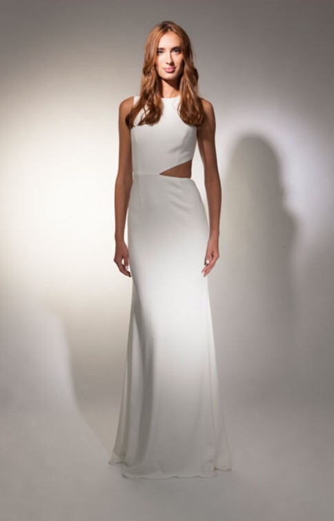 Her column dress has an abdomen cut out.