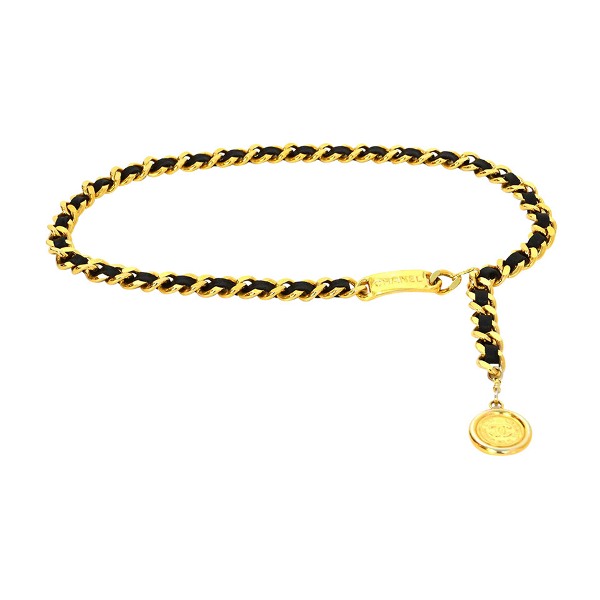 Her vintage woven black leather belt hails from 1994, featuring the brand’s iconic gold chain link, coin charm, and dog tag.
