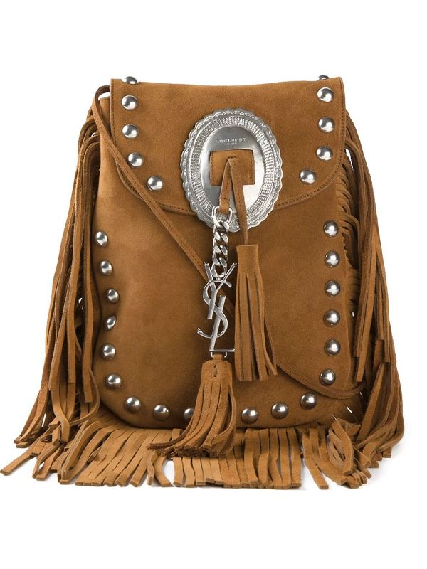 Her tan brown suede shoulder bag showcases a front flap closure, an adjustable shoulder strap, fringe detailing, silver-tone stud embellishment, and a large concho on the front.