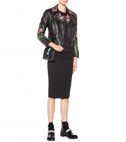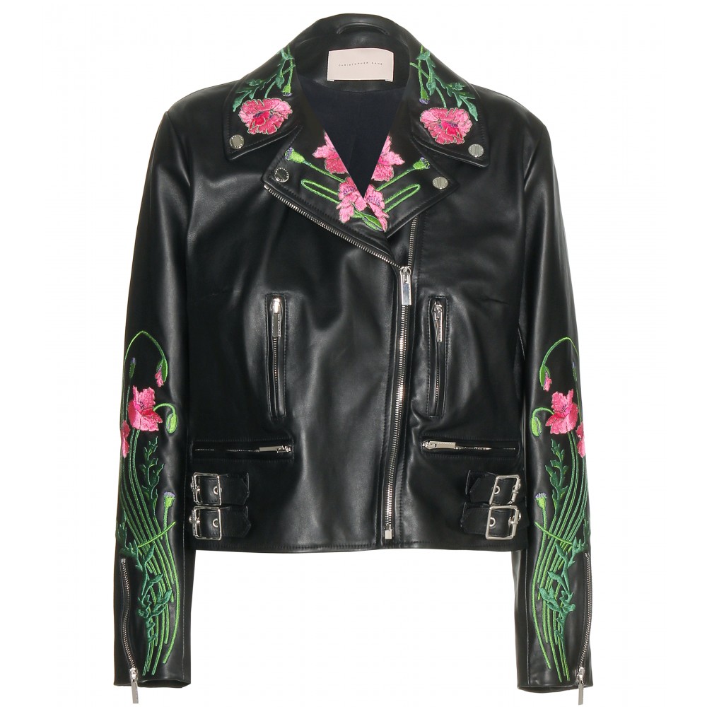 The jacket features zipper detailing, asymmetric fastening and pink/green floral embroidery.
