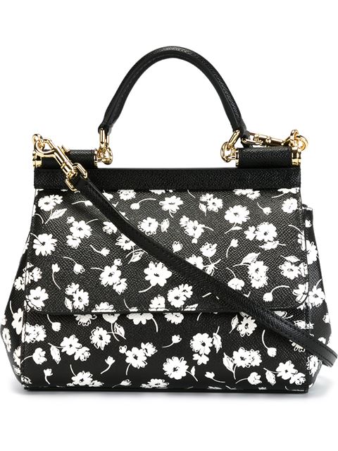 Her classic Sicily bag is updated by a bold floral motif scattered across rich textured leather, all finished with dual carrying options and gleaming hardware.