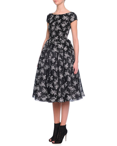The Dolce & Gabbana floral-print chiffon dress has a bateau neckline, cap sleeves, and a full skirt.
