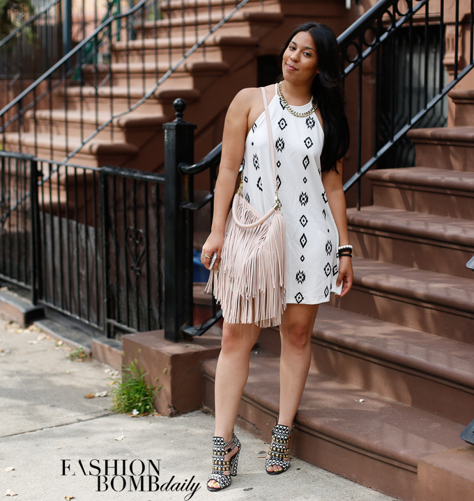 Jewelry designer Trenna Seney of LoveTrenna.com paired Zara sandals with a printed dress and a fringed bag.