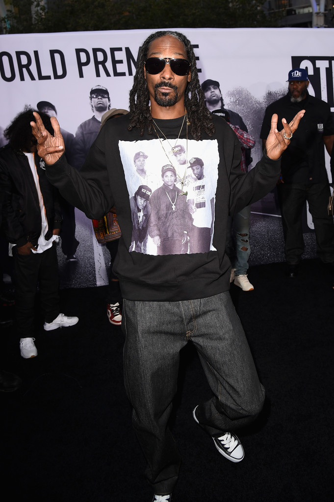 Snoop Dogg/Lion represented for the film in an NWA sweatshirt and jeans.