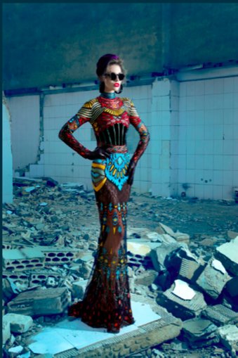The exact dress wasn’t modeled in the Fall 2014 collection, though you can see a similar multicolor design below: