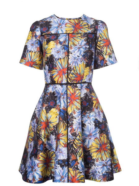 Her firework print frock is crafted from silk and cotton. It features a flare silhouette and short sleeves.