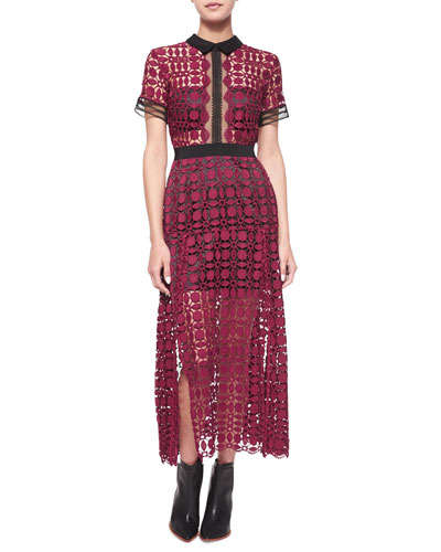 Her midi dress is crafted from guipure lace. It features contrast trim, a spread collar, short sleeves, a sheer-trim front, banded waist, sheath silhouette, slit detailing, and scalloped hem.