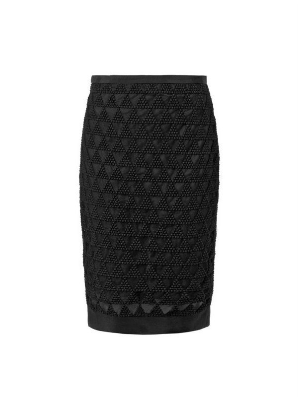 Her matching skirt features a pencil silhouette, silk trim, and a sheer hem panel.
