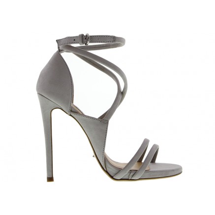 Her blue-grey nubuck sandals boasts crossover straps and 4.7″ heels.