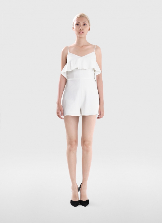 Her playsuit features a form-fitting bodice, pleat detailing at the front and back, and thigh-baring shorts.