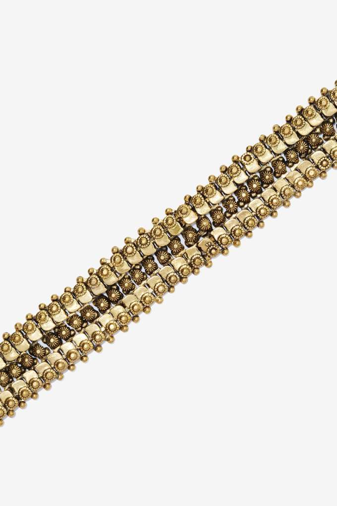 Her choker has a thick gold chain at the front and a thin adjustable chain with a lobster clasp closure at the back.