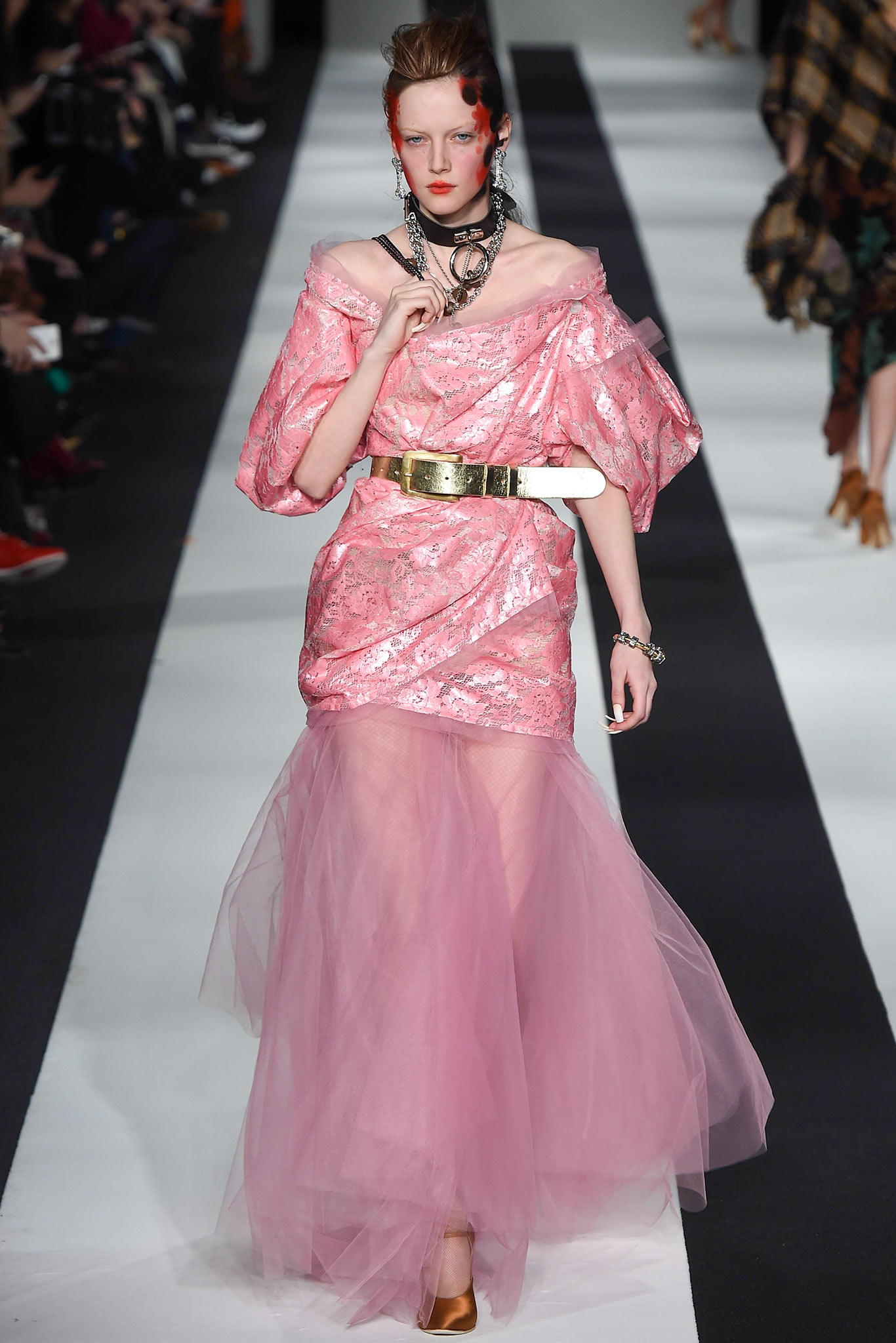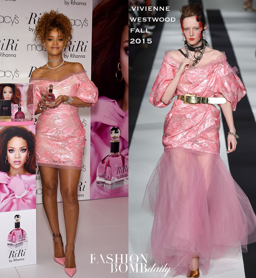 Rihanna unveiled her Riri Fragrance at Macy’s in Downtown Brooklyn in a bubblegum pink off the shoulder mini dress by Vivienne Westwood’s Red Label.
