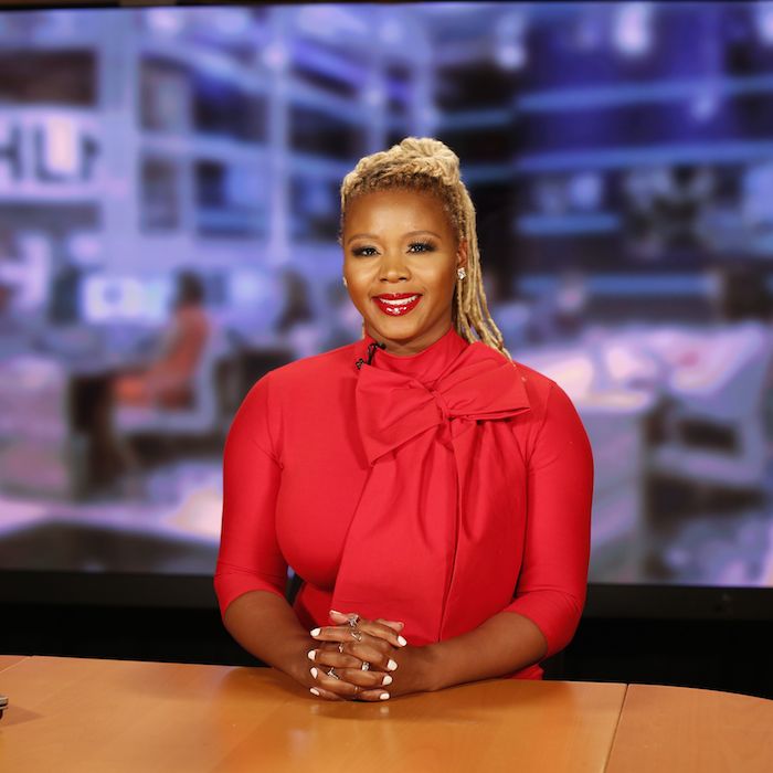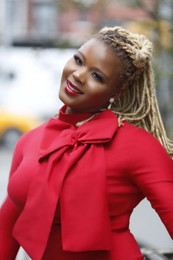 Solid colors always work well for TV (so I am told!), so I decided to wear my K Mills Collection signature bow dress.