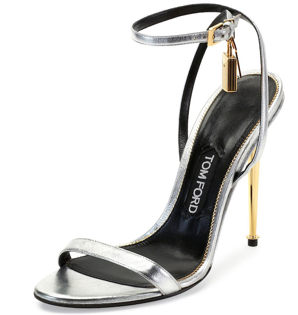 She amped up her look with her fave 4 1/4″ golden stiletto heel adjustable ankle wrap sandals with padlock and key details