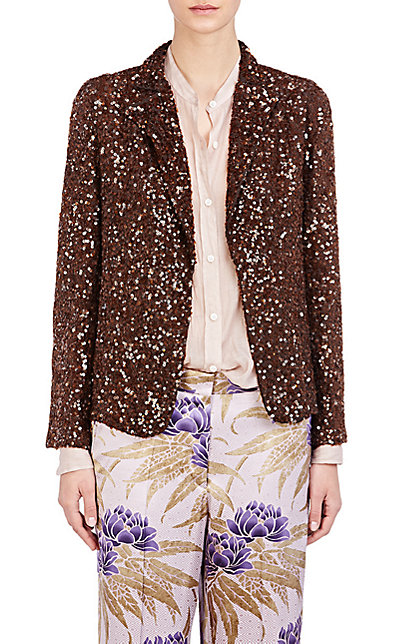 Her open-front sequin embellished jacket features notch lapels, slit cuffs and is crafted of brown silk.