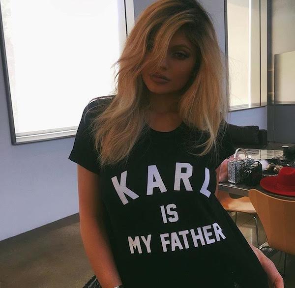 Kylie Jenner posed with a pout and a new blonde ‘hair-do’ on the ‘Gram while sporting a $58 Eleven Paris ‘Karl Is My Father’ Round Neck Short Sleeve T-Shirt: