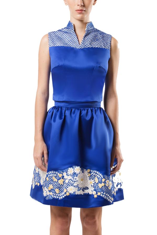 Her two-piece set features a cobalt sateen blouse and skirt.