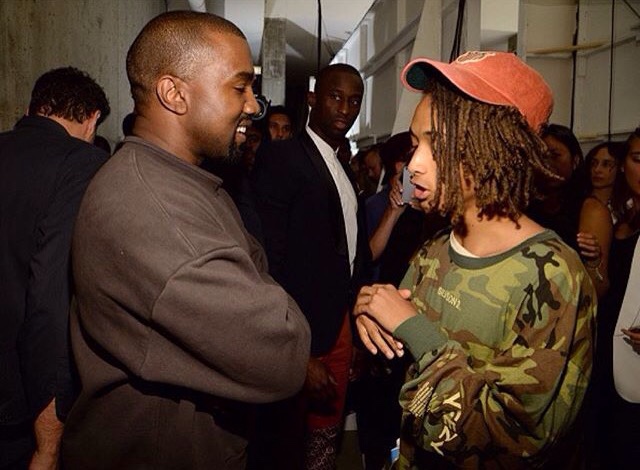 Jaden Smith chopped it up with Ye backstage, and rocked a Yeezy Season 2 Camo shirt.