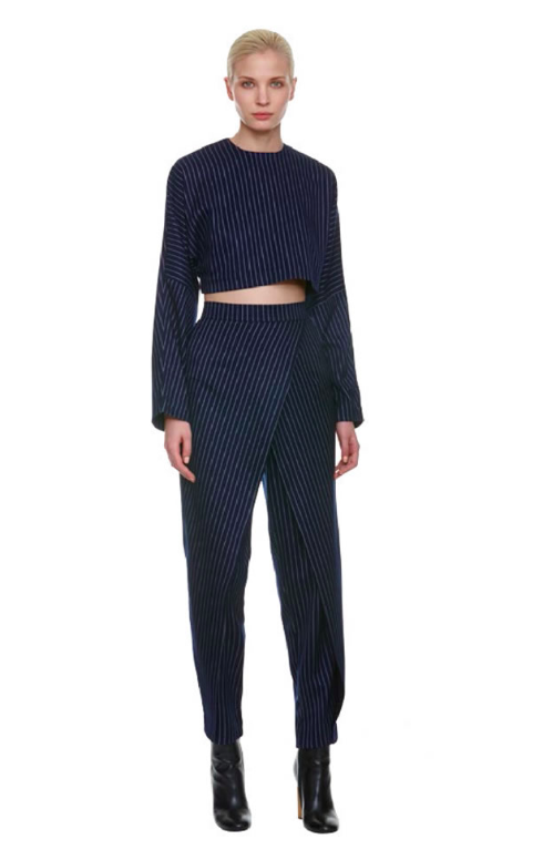 Her long sleeve pinstripe crop top with panelled sleeves is crafted from a mediumweight luxurious wool. Her pants have a cropped silhouette.