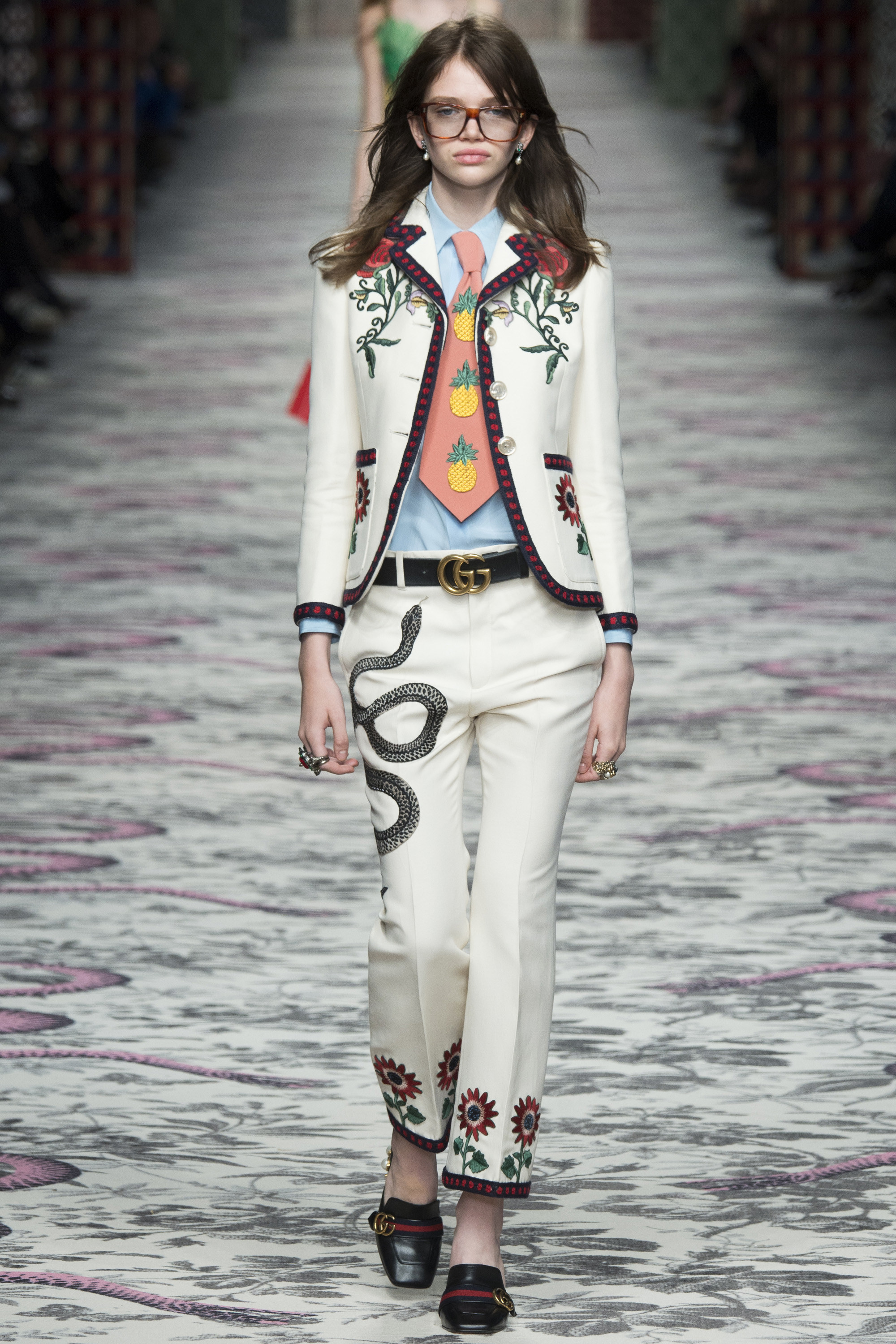 The school girl ensembles originally shown in Fall 2015 made quite a few repeat appearances — berets, flowers askew, signature Gucci red-and-green striping, oversized reading glasses, and pleated skirts were in heavy rotation. It was a remarkable thing the first time, but in a second take, it makes me wonder whether I should come to expect this in every collection. Some things didn’t strike a chord for me, including a pineapple tie paired with a white suit with a snake wrapped on the pant leg and a striped shirt with flowers over the chest.