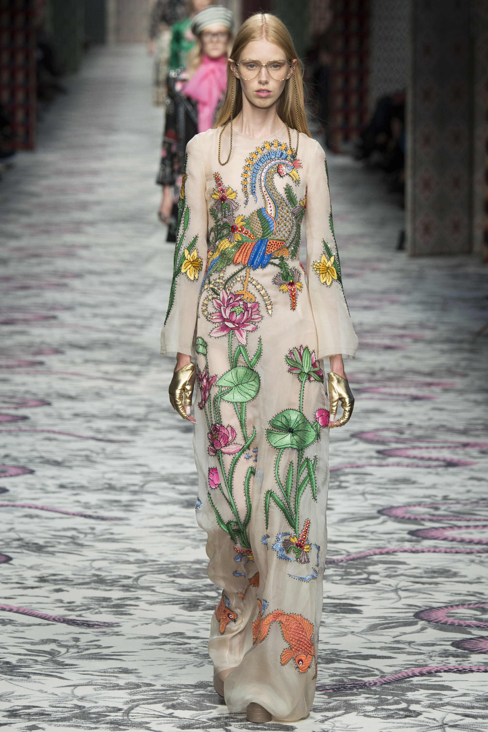 If the Fall 2015 RTW Collection ushered in an era of uncertainty and excitement with the rise of Alessandro Michele (newest Creative Director behind Gucci), this Spring 2016 RTW Collection took us firmly in the land of his rejuvenated Gucci woman, back from her respite. There was literally land and sea printed on a bohemian-style dress with terms like Obedience, Generosity, and Sincerity. If those words were any indication of where the brand is going, I’m willing to go along for the ride.