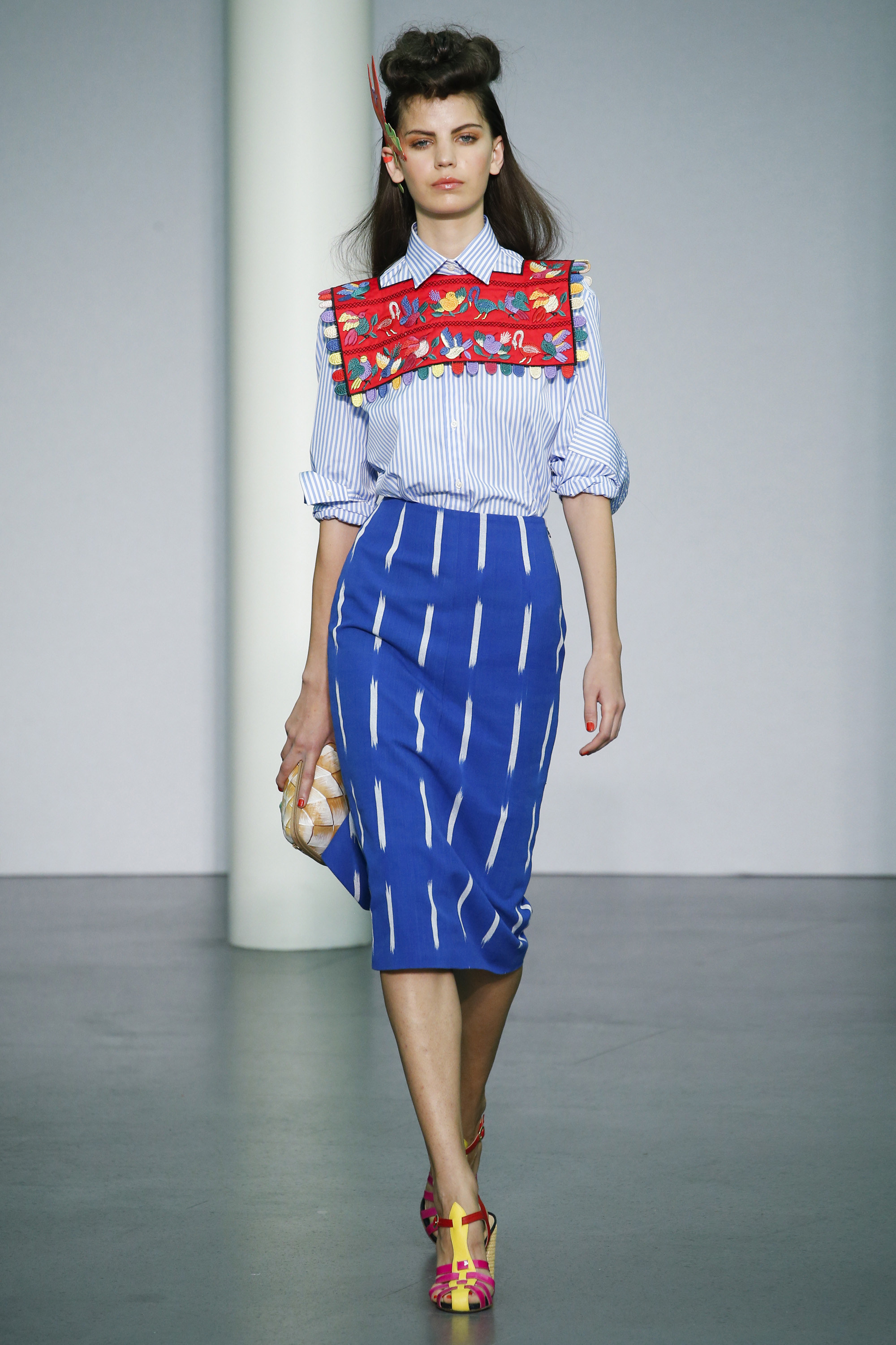 The accessories alone could have been their own post — she incorporated metal fish and paper-doll necklaces and sculptural clutches in pink, blue, and tan gingham for the models to carry. Even the footwear (which on occasion can be an afterthought in a collection) was incredibly festive and for the most part, could transition well into everyday women wearing her pieces. Some of my favorite ensembles included a batik-inspired tight pencil skirt in navy blue, another handkerchief embellished light blue skirt, and a green canvas short jacket with intricate beading on the sleeve. You are guaranteed to stand out when you rock one of her pieces and that is one of the attributes I admire about the brand.