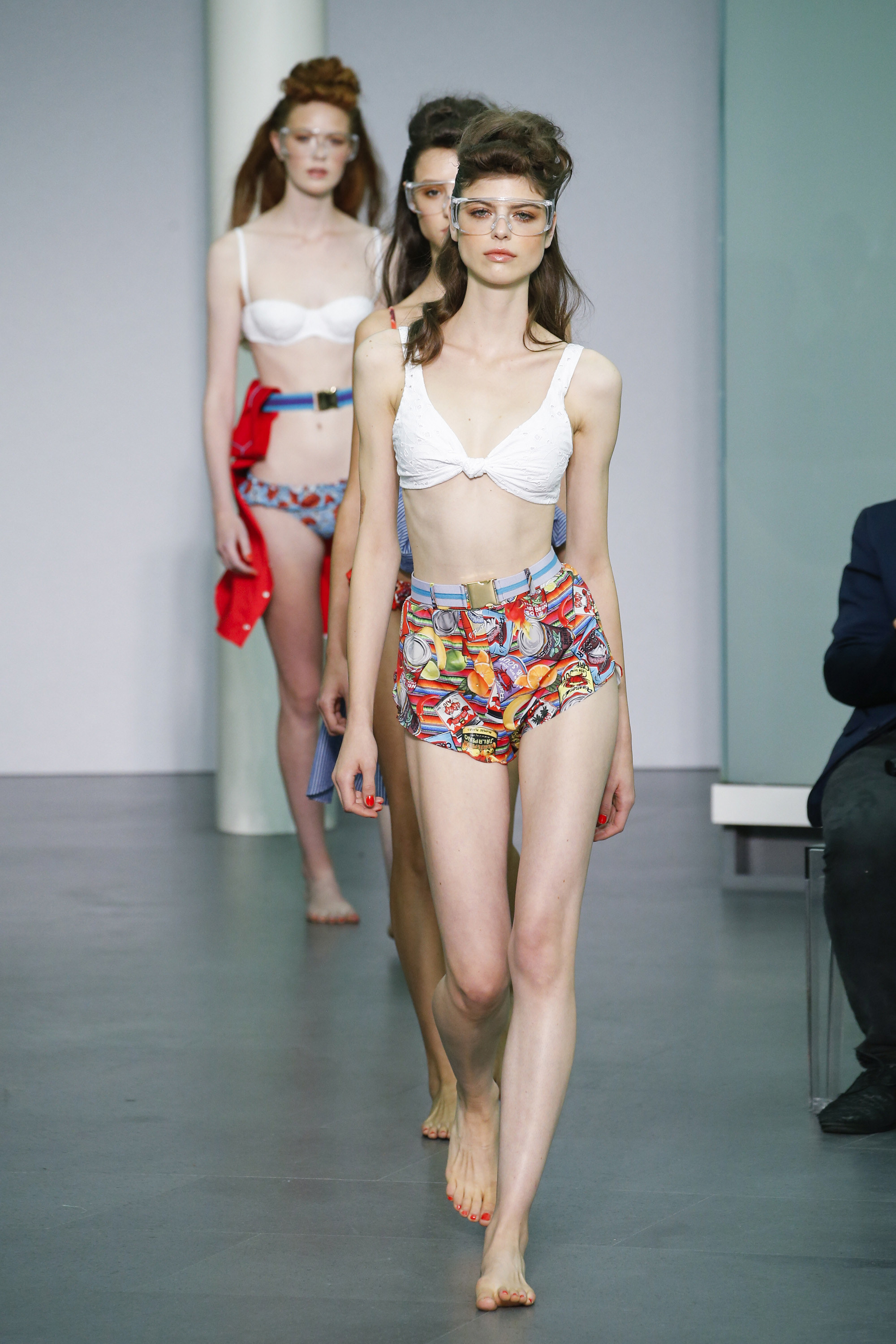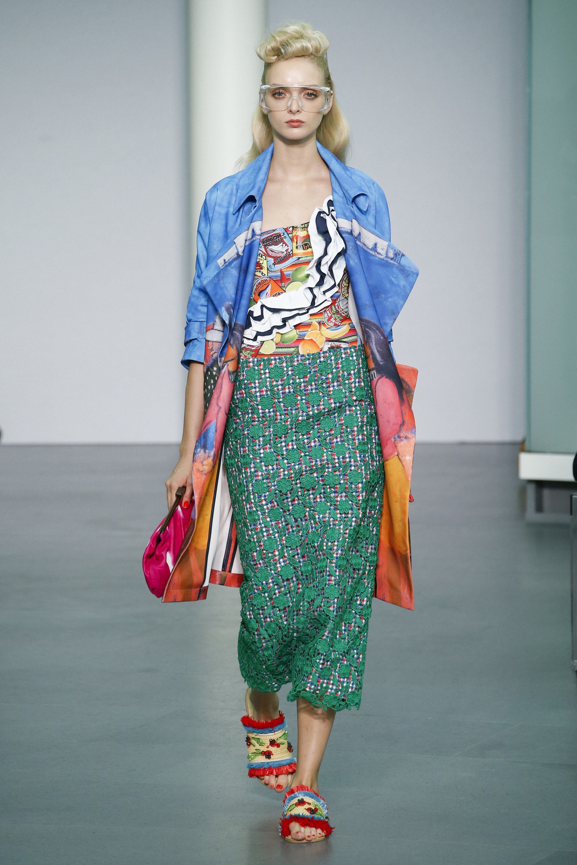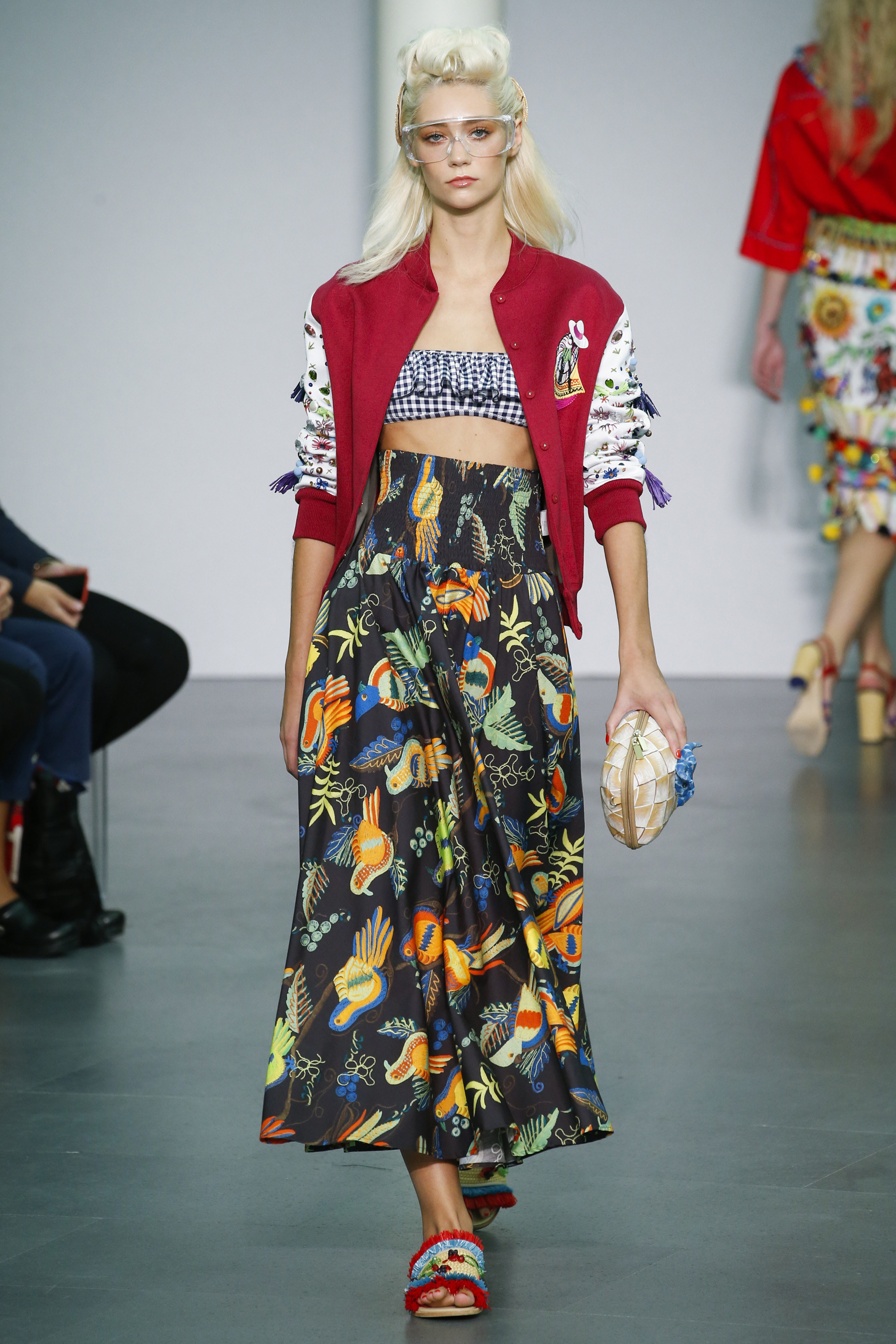 The theme of this collection was overwhelming inspired by a multitude of things; by the looks of the color palette and visual motifs emblazoned on jackets, one could argue her inspiration was Latin America, Haiti, parts of Africa, and/or Italy. Graphic tees that looked almost vintage boasted “C’era una volta America,” which translates to ‘Once Upon A Time in America’ in Italian. She worked in a futuristic vibe with the hair styling (very high tousled buns), the eyewear (scientist-style laboratory glasses), and wide-brimmed visors (in watermelon print, mind you!).