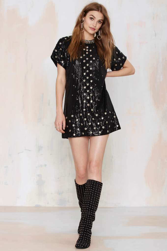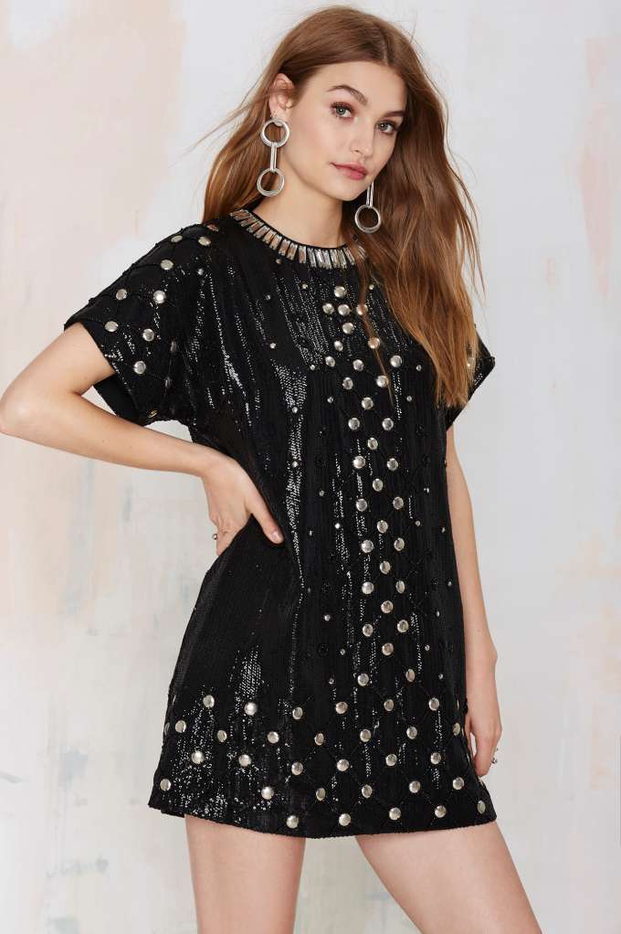 The Shine Off Sequin Dress uplifts crystal detailing at the neck, silver studs and tons of black beading.