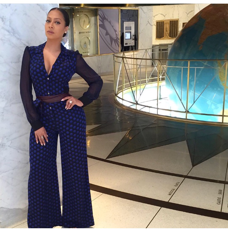To start things off, we have the lovely LaLa Anthony! The TV personality struck a fierce pose as she uplifted a black/blue polka dot print jumpsuit by Diane von Furstenberg. Her ‘fit also features pinstripe sheer sleeves and a wide leg silhouette. She also accentuated her waist with a leather belt. Hot!