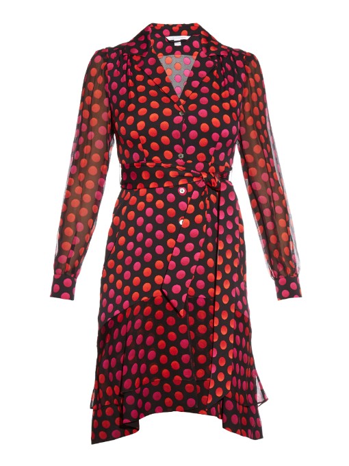 Her red and pink polka-dot print has a button front.