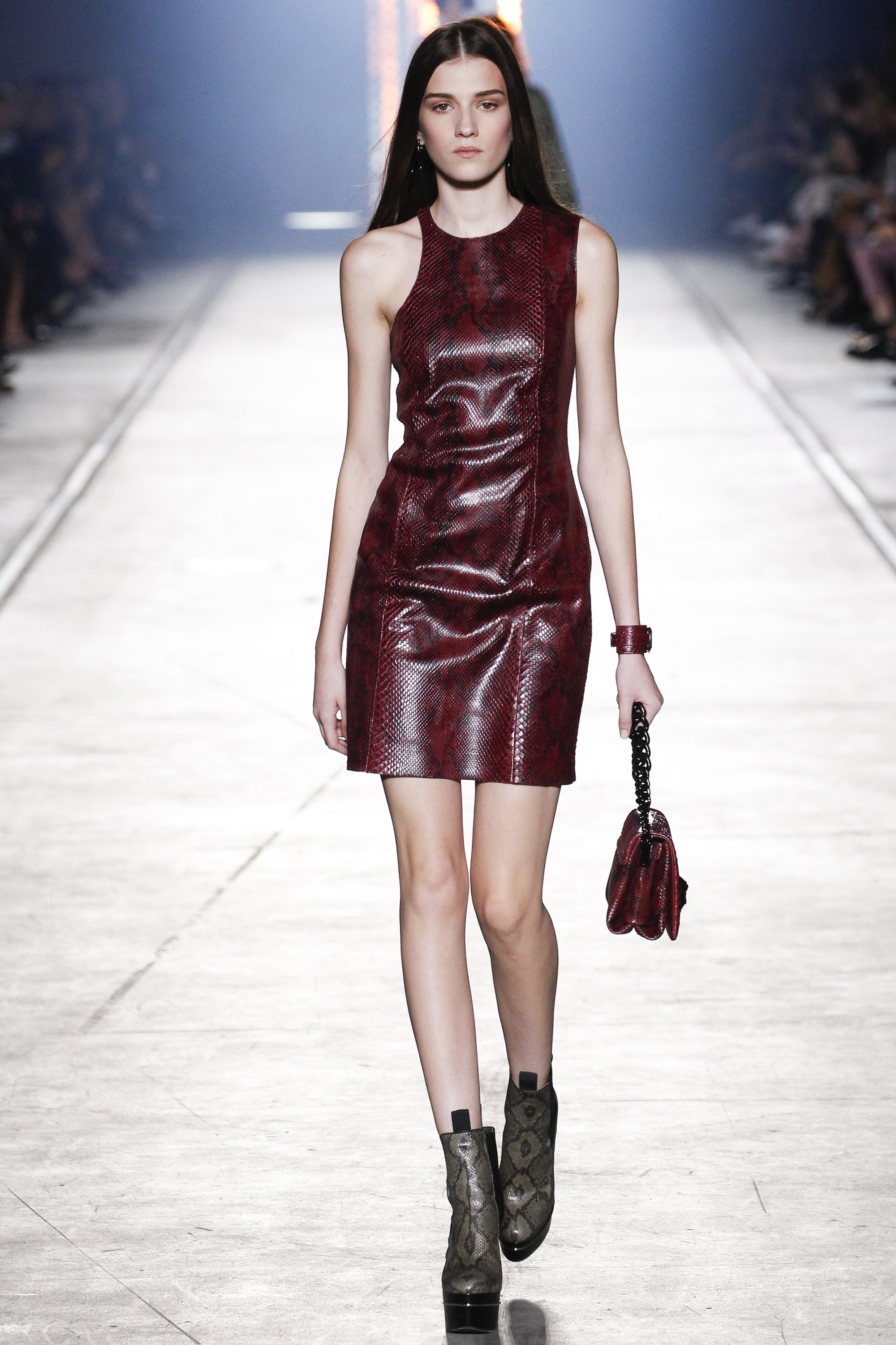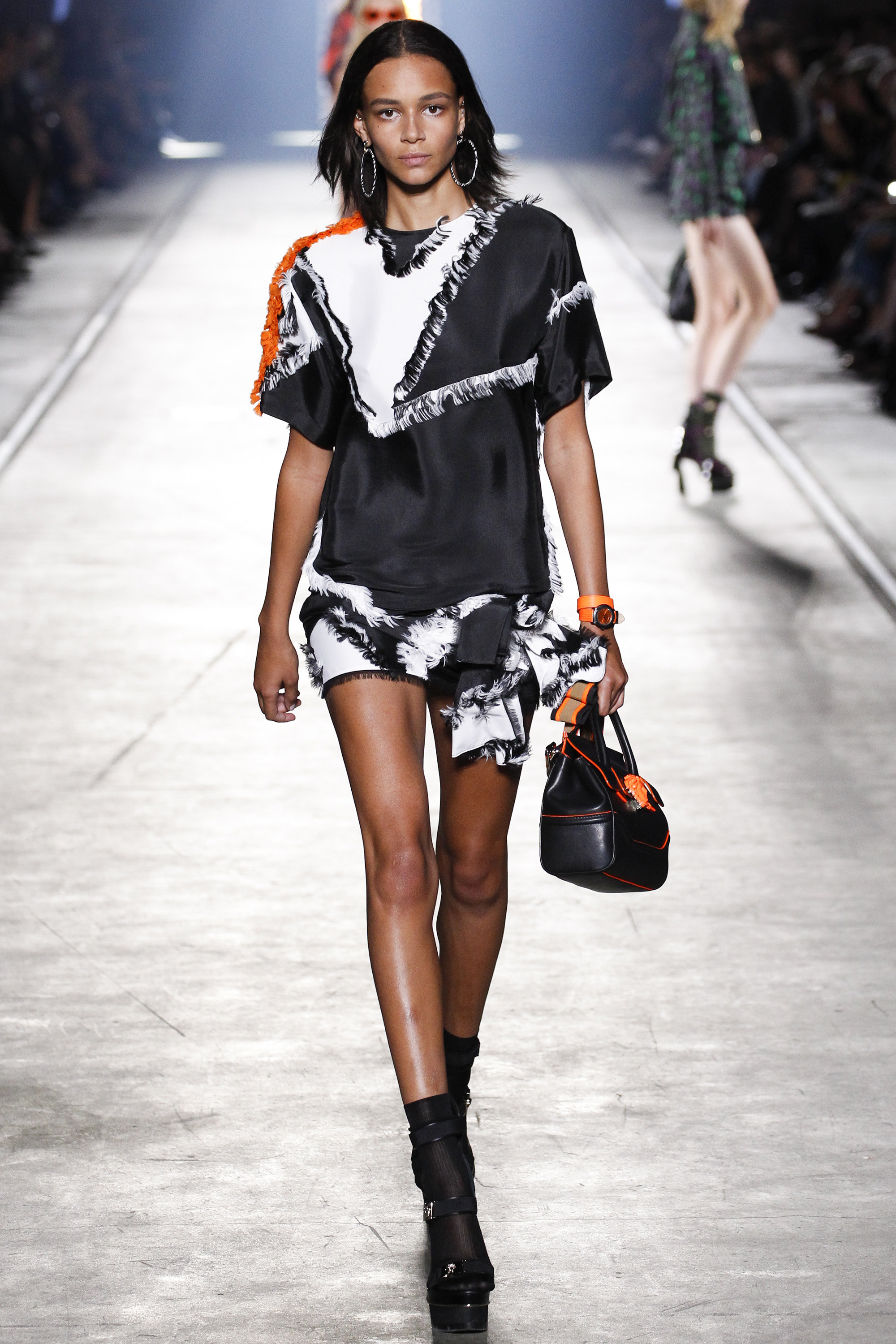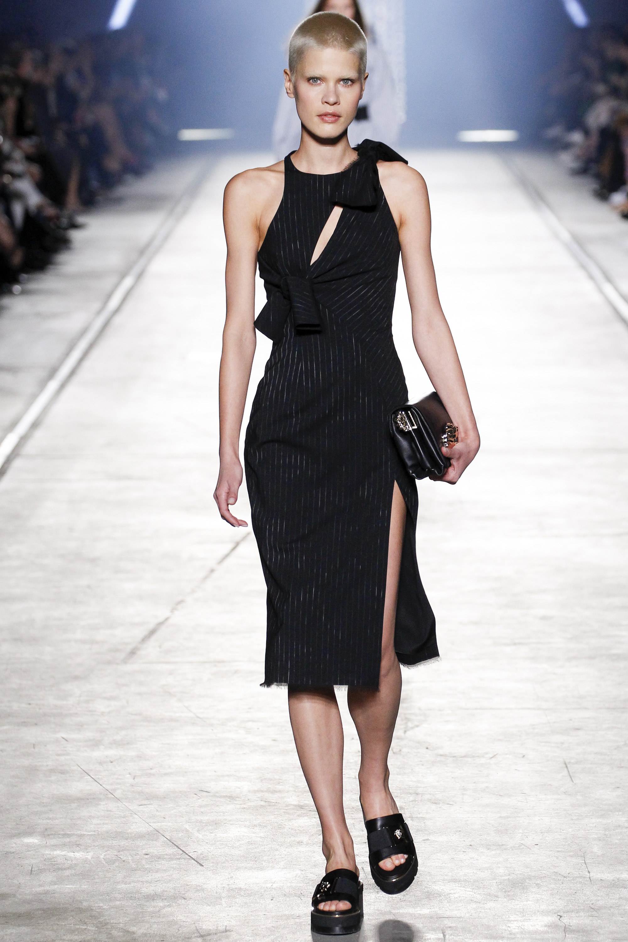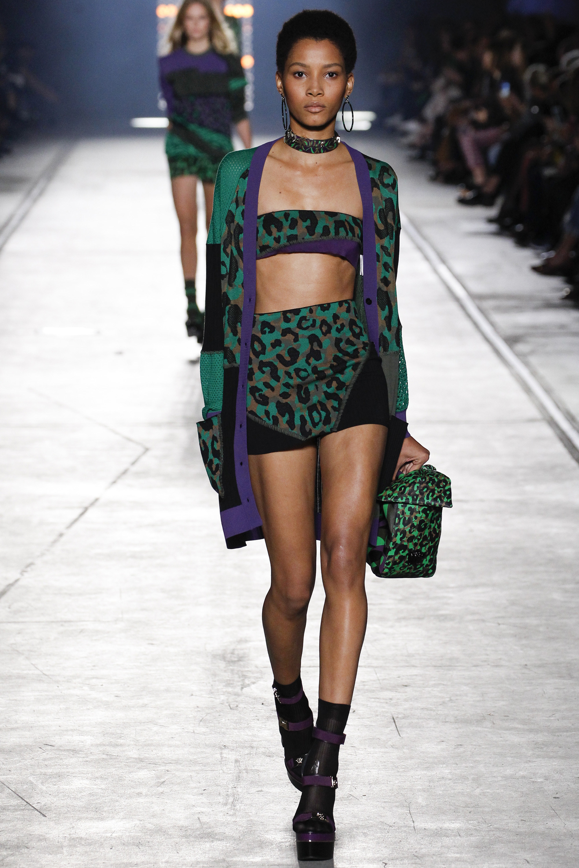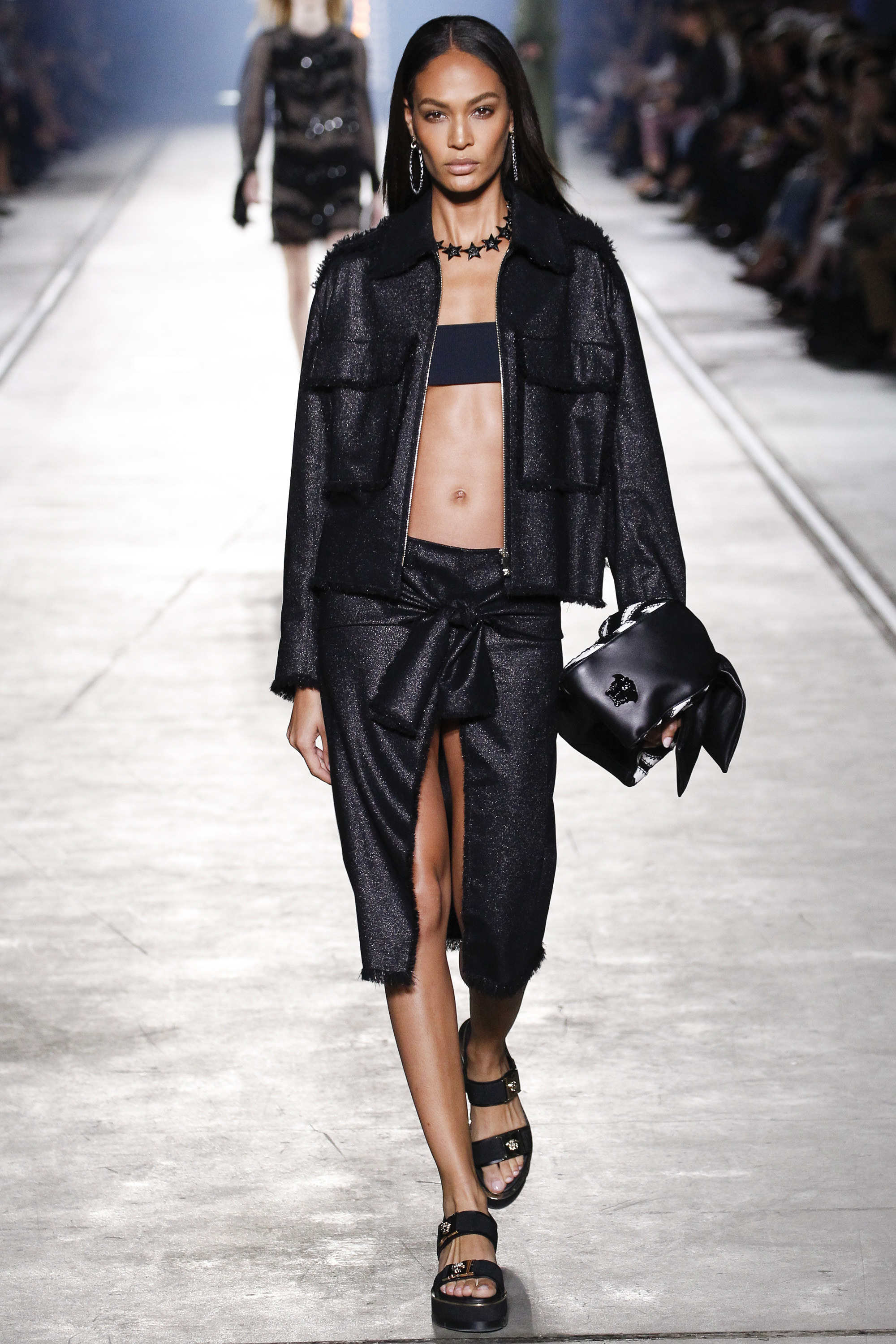 The thigh-high slits in curve-hugging dresses still made an appearance, but those looks were balanced by separates and cropped bandage tops one might choose to wear everyday. Supermodel Joan Smalls rocked an all-black outfit that consisted of a sportswear jacket, bandage top, and tied-at-the-waist skirt that I’m pretty confident Rihanna would wear straight off the runway. There were touches of the Versace logo on the shoes and accessories, but for the most part, the pieces were devoid of being over-the-top and full of wild wearability.