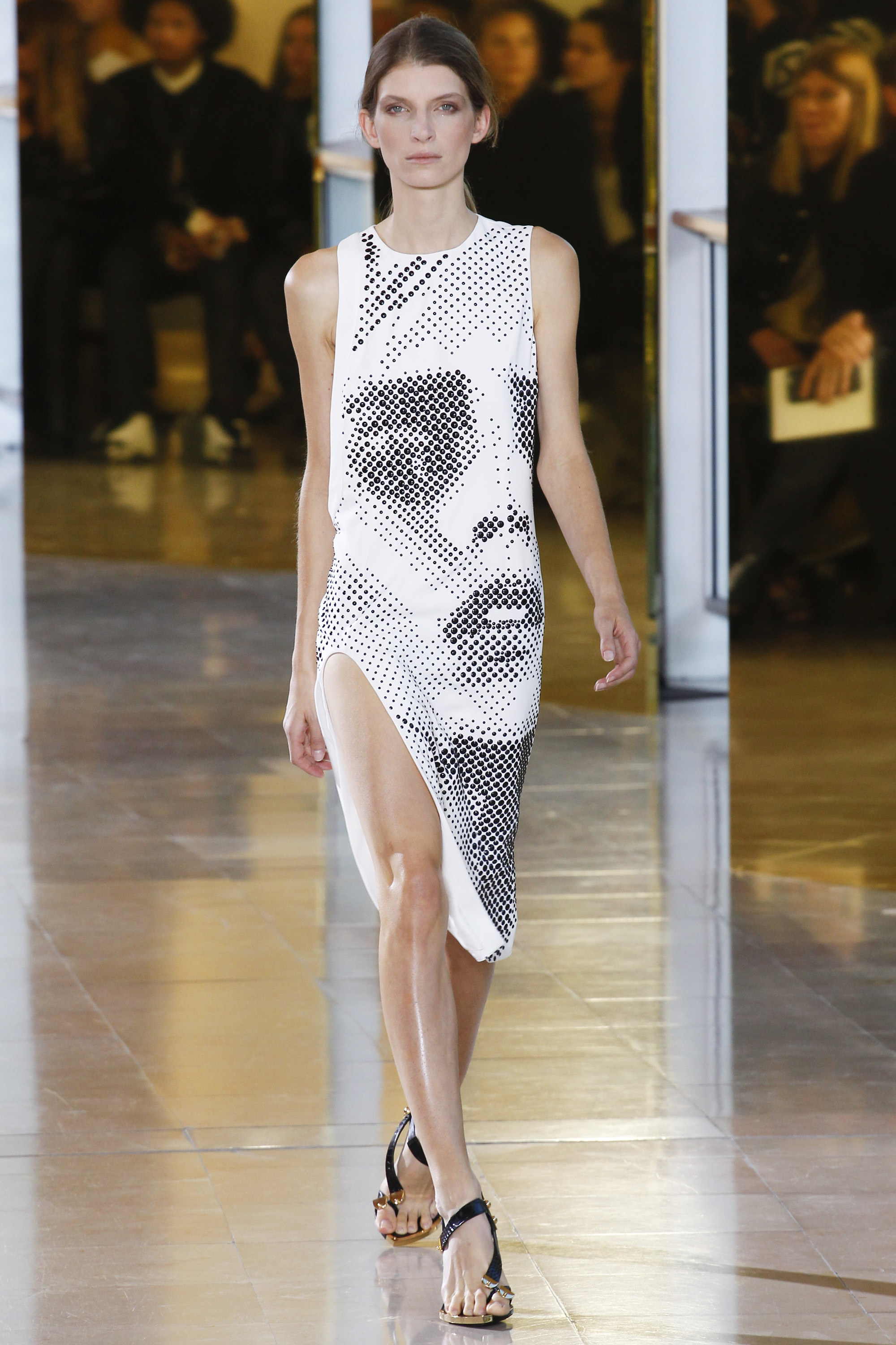 It wouldn’t be a Vaccarello show if not for some graphic element. Vaccarello had experimented with graphic text overlay on fabric in previous shows, but this time he opted for an artistic rendering of model Anya Rubik‘s face on a number of pieces, including varied dresses and tops. The rendering was not printed, but actually beaded onto the fabric and it had a compelling effect on the runway.