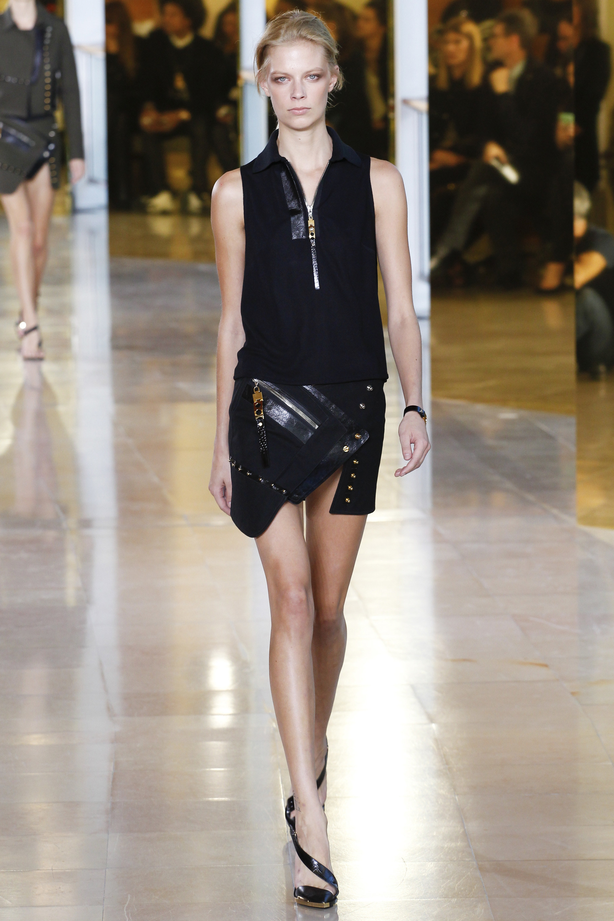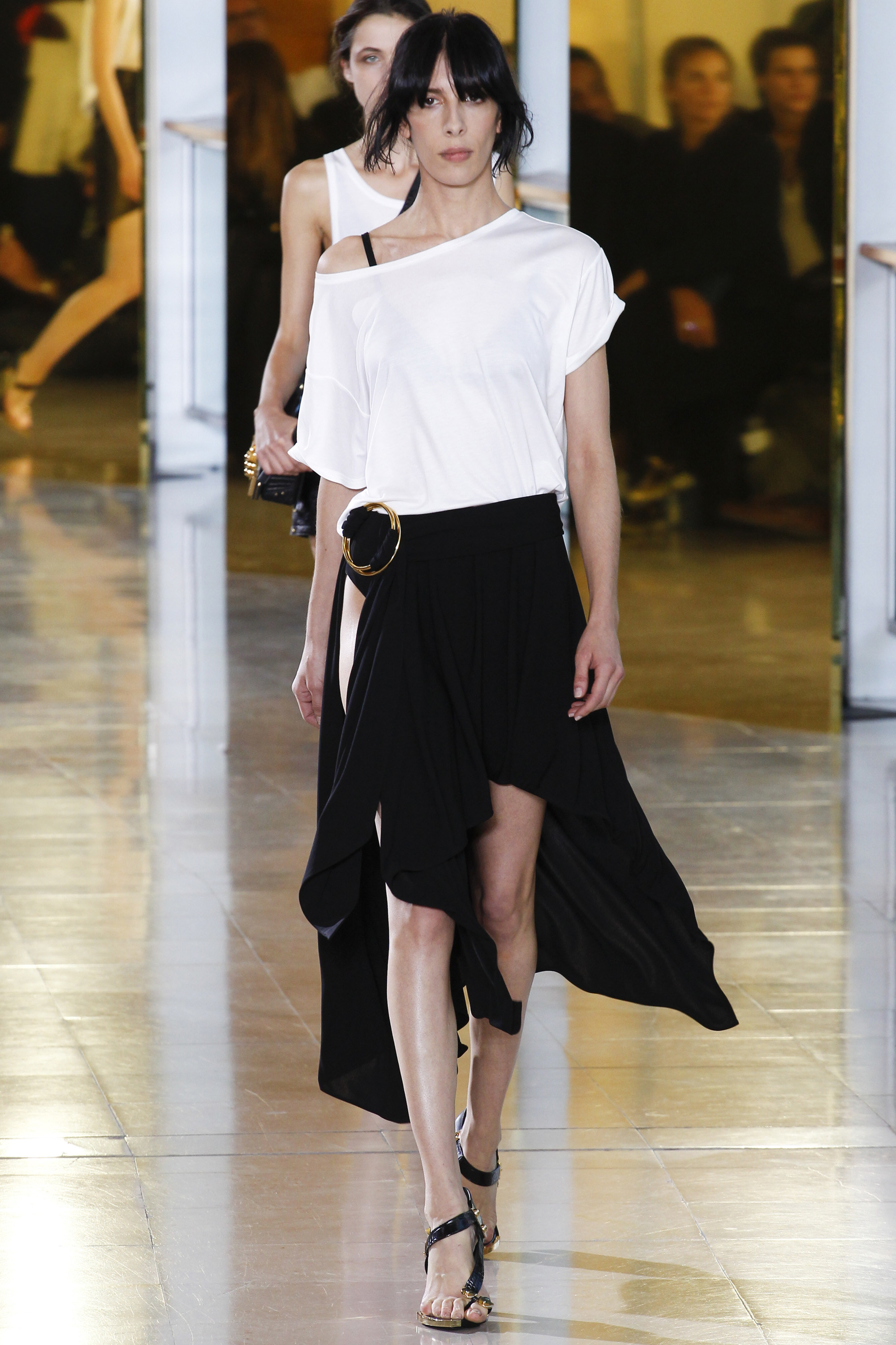Notable additions to this show were his emphasis on denim and his very first bags; both are important components to a collection as they can often be offered at a more accessible price point for consumers. The denim was mostly high-waisted, form-fitting, and featured metal enclosures at the ankle. The bags ranged from a black leather clutch to a few cross-body styles. Some of my must-have pieces were the grey and black skirts and dresses worn by Binx Walton and Jamie Bochert, in particular. These asymmetric looks were equally sultry and effortless.
