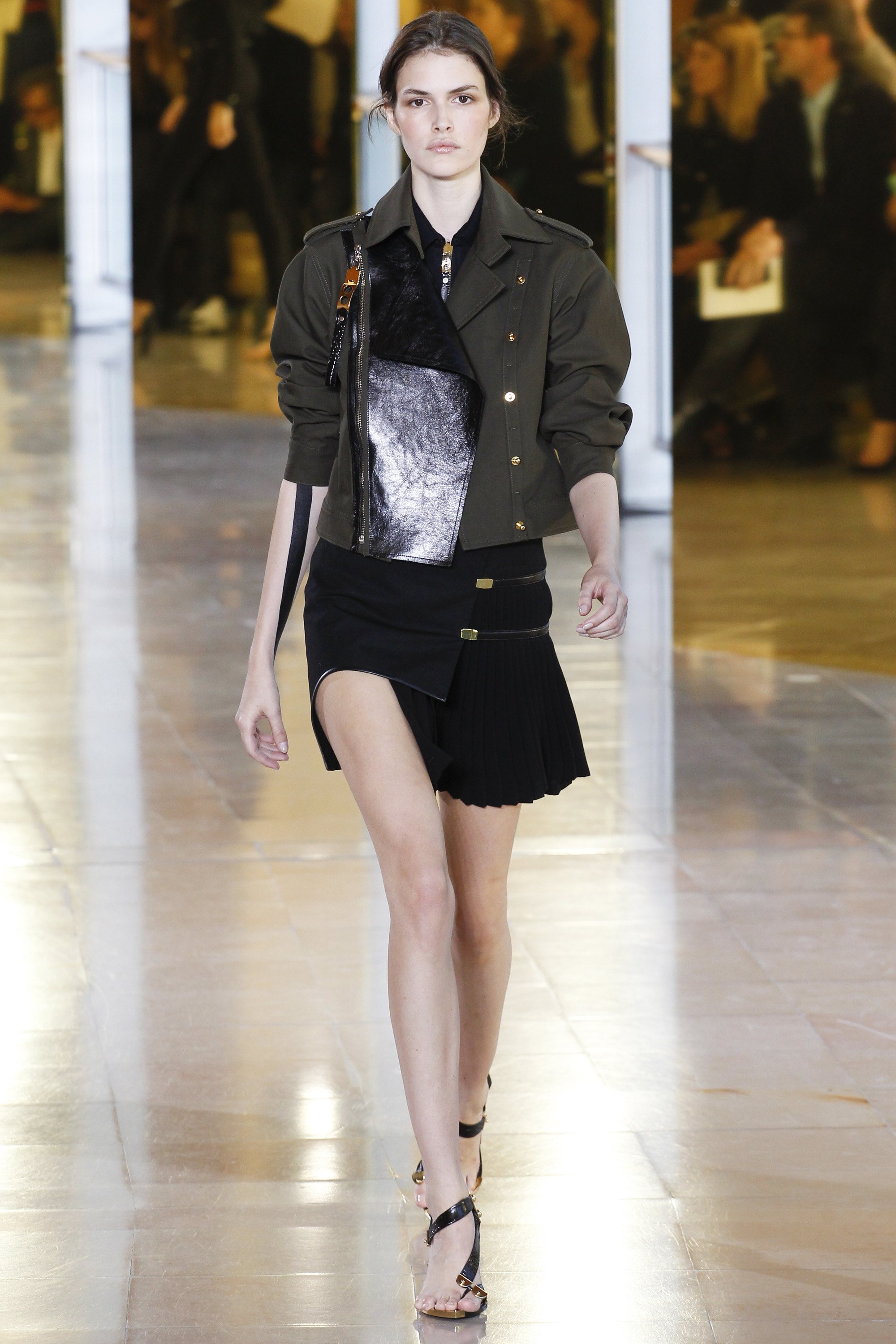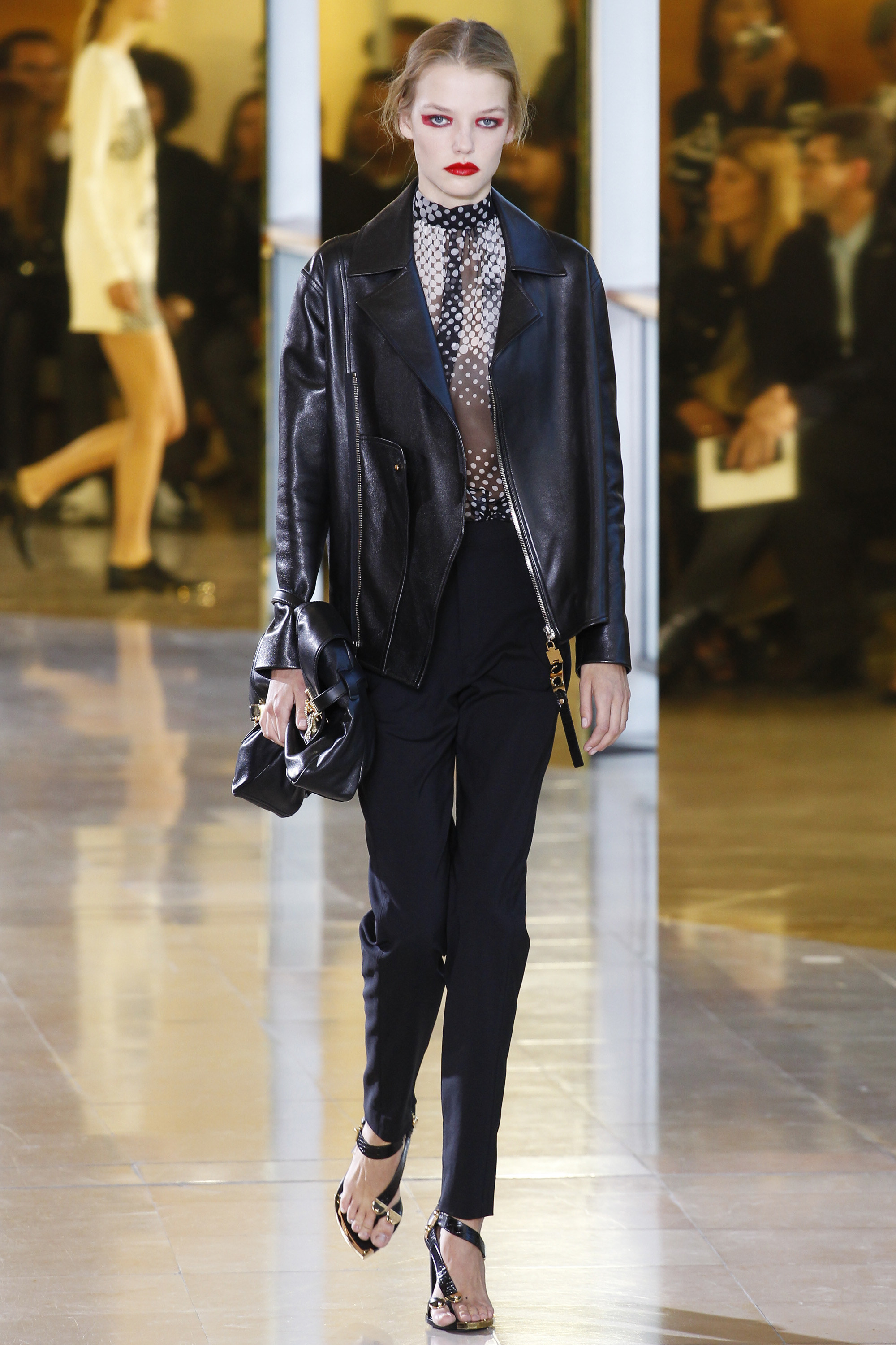 There was a militaristic edge to the mixed media jackets, oversized metal detailing, and structured suiting. Models were strong, self-assured, and dare I say again … quite comfortable. Perhaps gone are the days of super tight, overtly sexy ensembles? High slit skirts were still present, but styled with a sheer and patterned long-sleeved top. The dresses with high slits were almost longer or had a higher collar, so as to give the illusion of being more covered up than exposed.