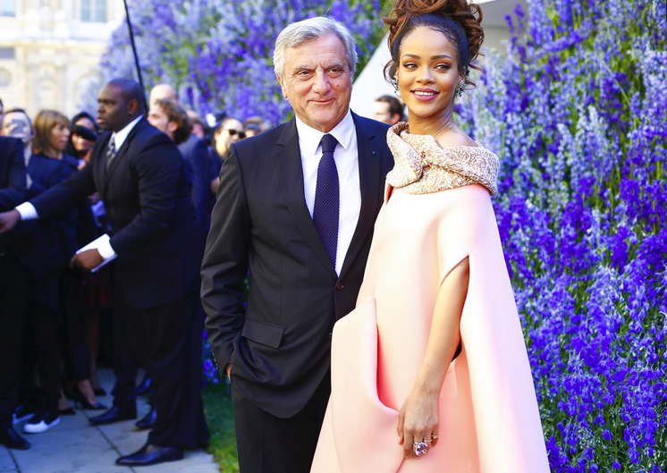 Rihanna was pretty in pink at the Dior Spring 2016 Show in a Fall 2015 Couture Pink Fur Sleeve Cape Dress and Black Patent Thigh High Boots from the French fashion house: