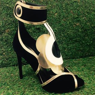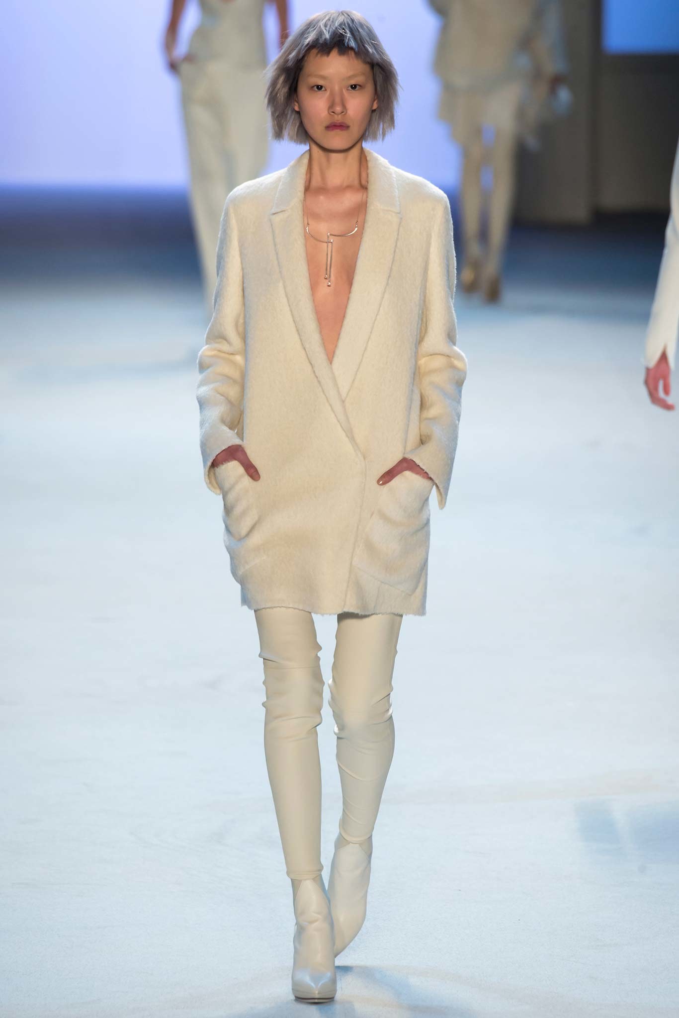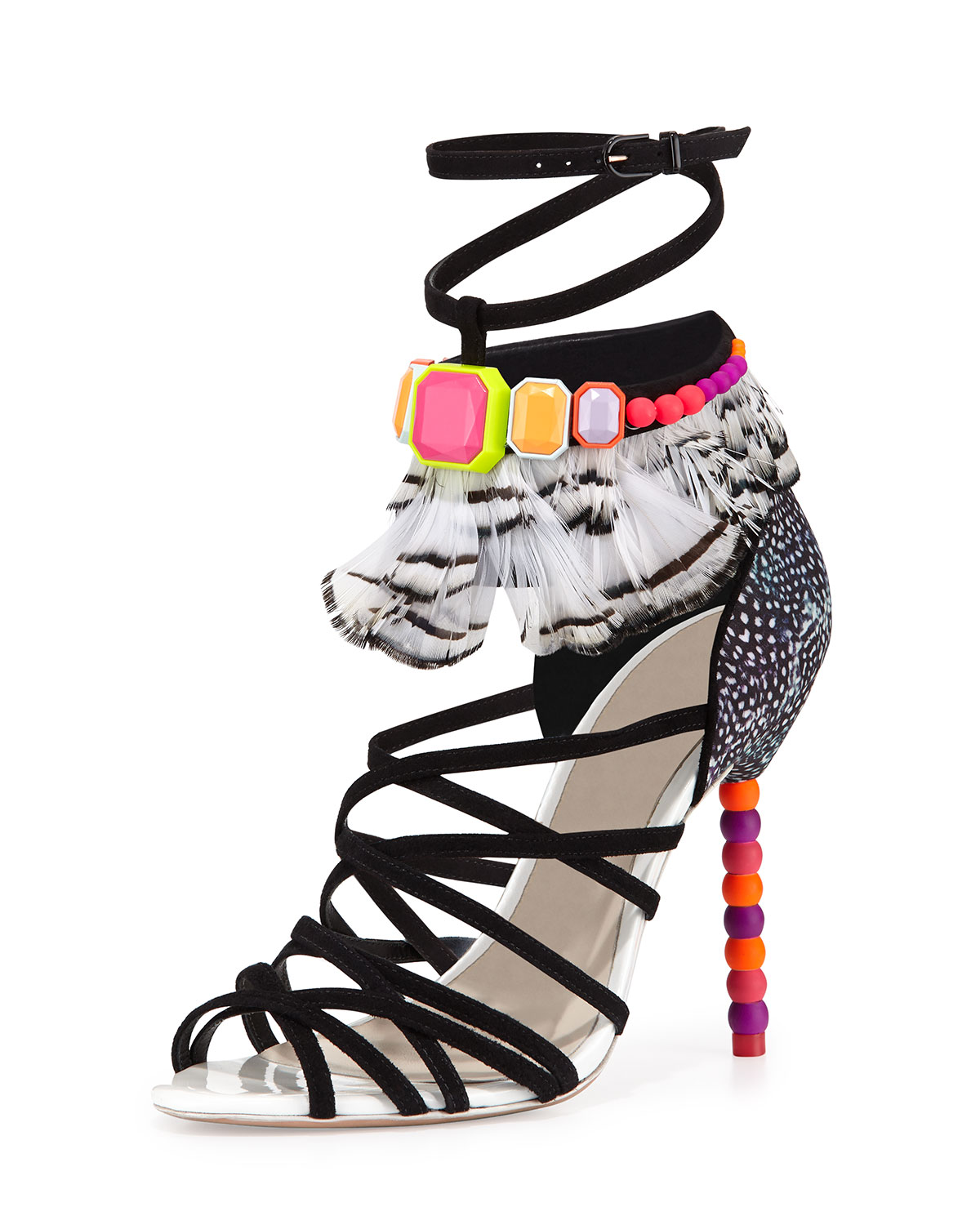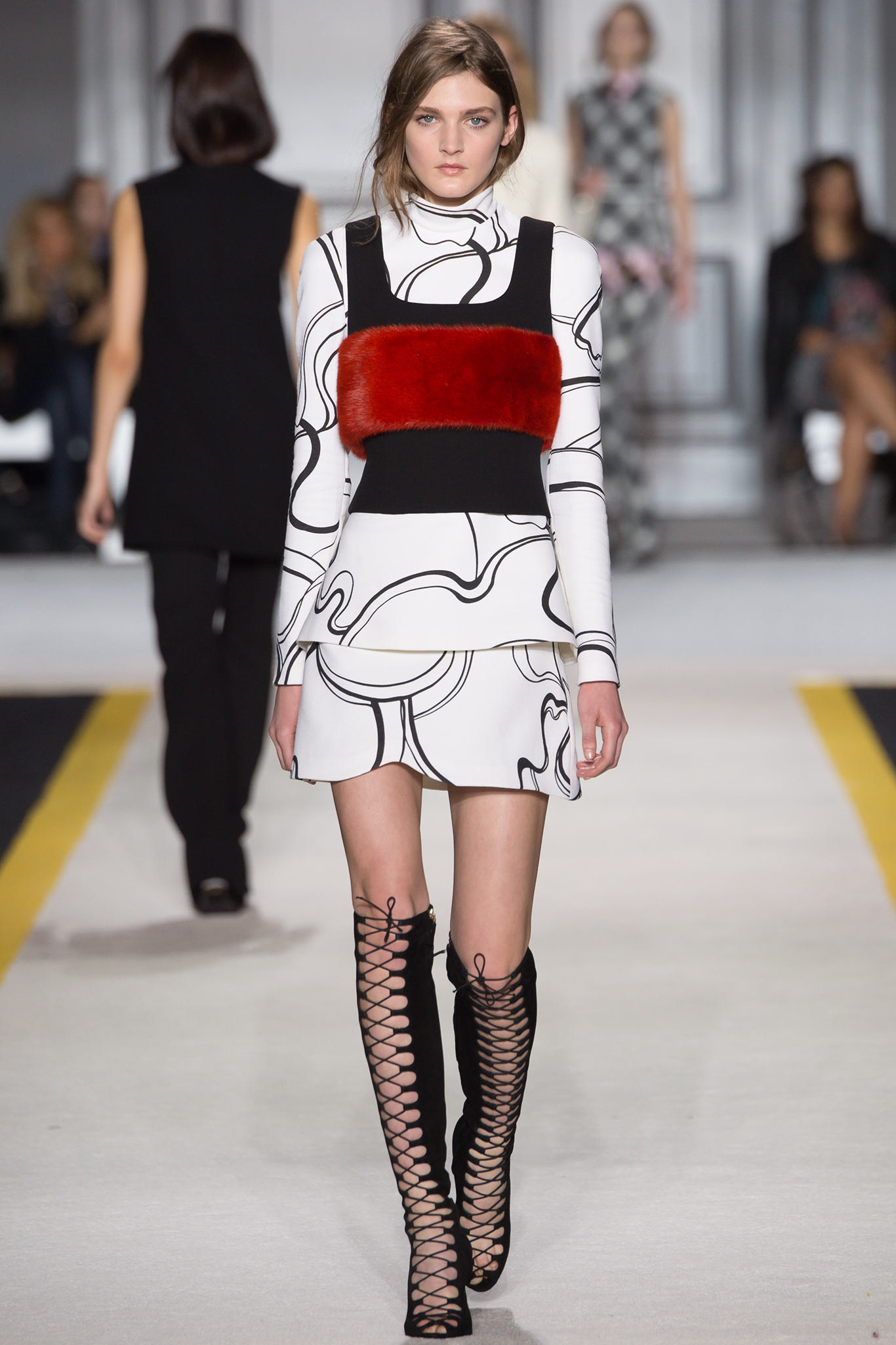 Lastly, for the Giambattista Valli show, she was styled in a swirl printed dress and coat from Valli’s Fall 2015 collection, topped off by $950 Sophia Webster Alessandra Feather Sandals.