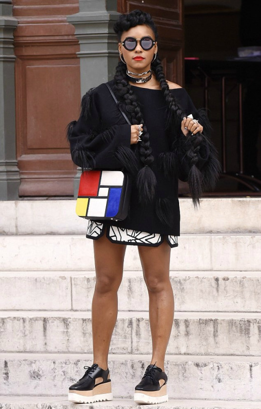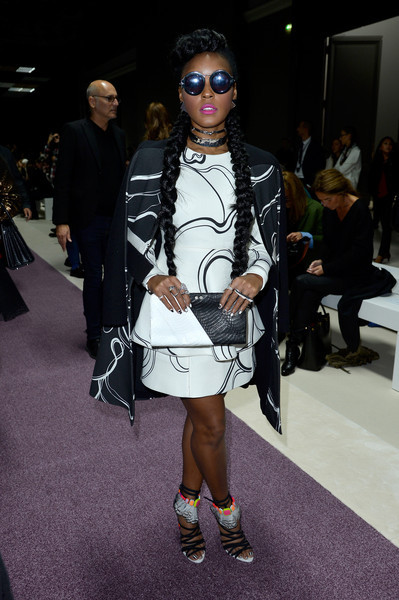 Janelle Monae and her stylist Maeve Reilly are painting Paris black and white with a series of delectable threads! Yes, the chanteuse has been sticking to her signature noir et blanc color palette, but has been injecting her looks with lots of punch with prints, textures, and fun clutches.