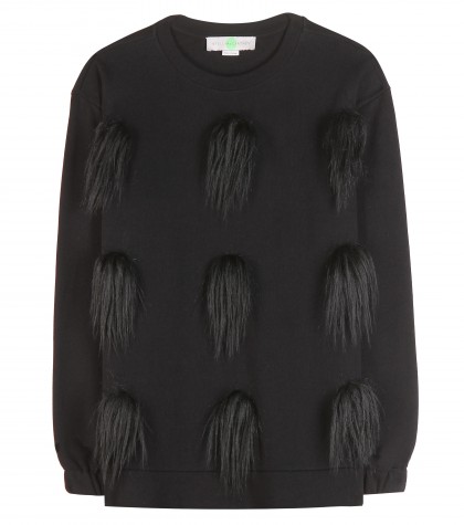 To take in the Stella McCartney collection, she rocked a $960 Stella McCartney Black Pom Pom Sweater, a Neil Barrett skirt, $1,100 Stella McCartney double platform brogues (similar below), and a Les Petite Joueurs Mondrian clutch.