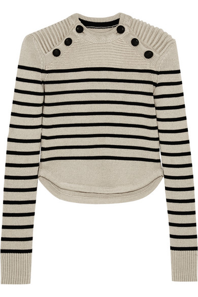 Her sweater is très français, and features classic Breton stripes and black buttons.