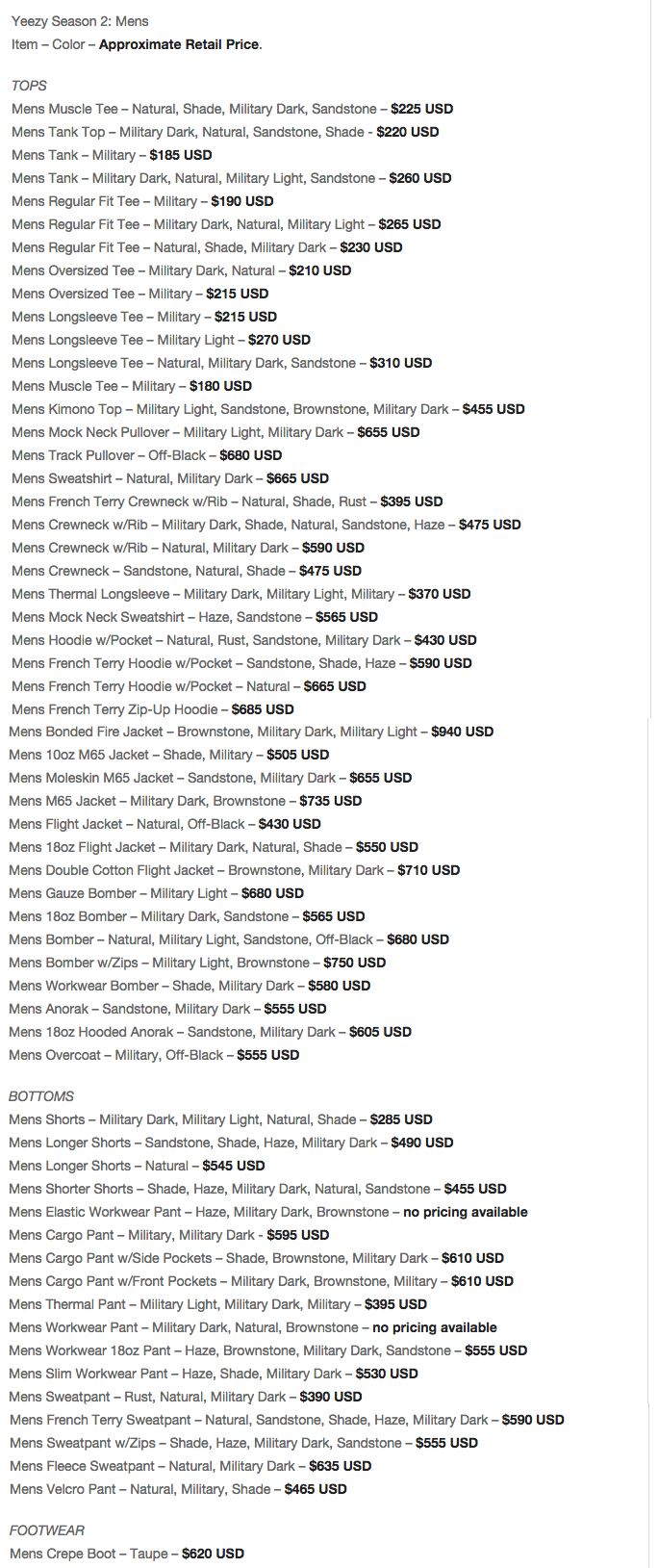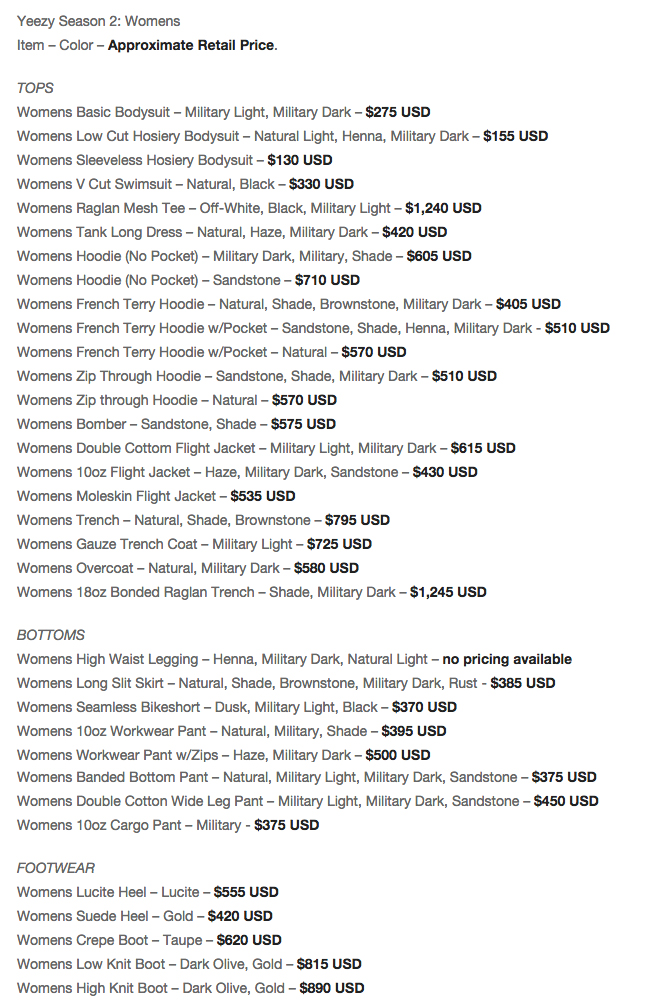 HypeBeast has the scoop on prices for items in Kanye’s Yeezy Season 2 Collection. As predicted, they are ridiculous.