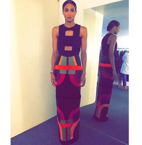 It’s clear that celebs love Tom Ford. This week, Ciara shut it down (via Instagram) in a Tom Ford Fall 2015 cutout dress. Her ‘fit features red, blue, green and yellow detailing, and a sleek silhouette. Yes!