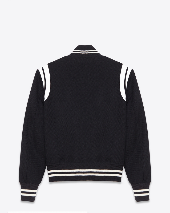 His classic Saint Laurent jacket has leather trim around the shoulders, and a striped ribbed collar, cuff, and waistband.