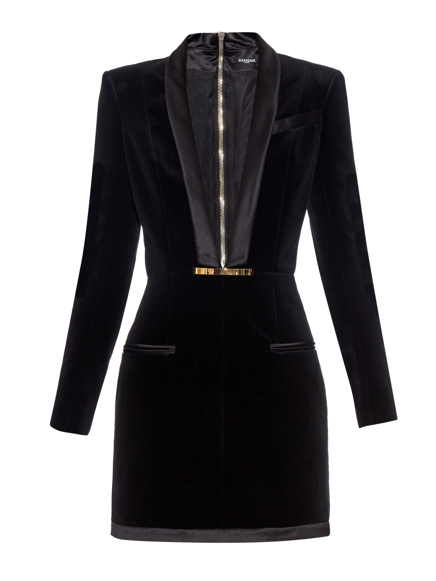 The mini frock is accented with gold-tone brass hardware, silk trims, a deep V-neck and a nipped-in waist.